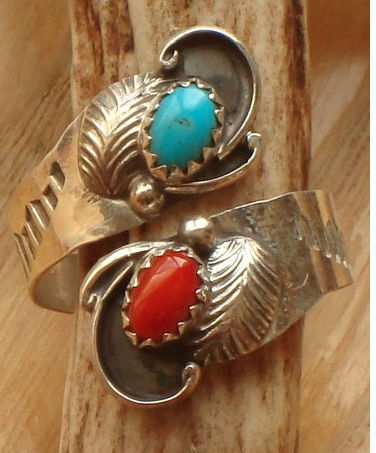 Bague-Navajo-western-mode - Bague amérindienne navajo ajustable en argent, turquoise et corail - Taille 54/55 - argent 925/000 (poinçonnée "sterling") - Vous pouvez ajuster leur taille de -1 et +1